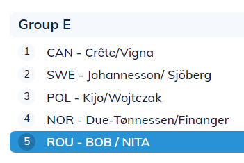 Echipa ROU - BOB / NITA (poti sa o susti pe Irina Bob aici) se bucura de compania unor echipe din Canada, Suedia, Polonia si Norvegia sperand la o clasare pe locul 3 in grupa E. Acestea au jucat impreuna la Campionatul European de Roundnet si s-au clasat pe locul 14/18.