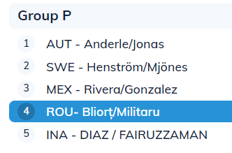 Echipa ROU - Limbovici/Popa (poti sa il susti aici pe Florin Limbovici) face parte din grupa F alaturi de echipe din Canada, Marea Britanie, Philipine si Danemarca si spera la o clasare pe locul 2 in grupa. In acest moment acestia formeaza si cea mai bine clasata echipa in clasamentul national si sunt speranta noastra la un rezultat foarte bun.